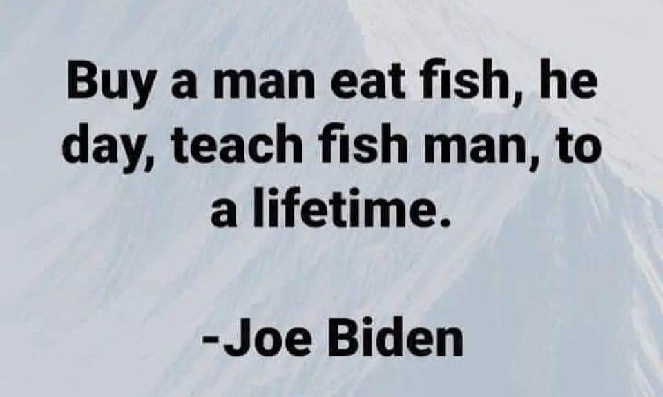 Joe biden buy a man eat fish. Buy a man eat fish he day teach fish man to a lifetime. Sometimes you need to read between the lines in the aphorism they present to you. Give a man a fish and you feed.
